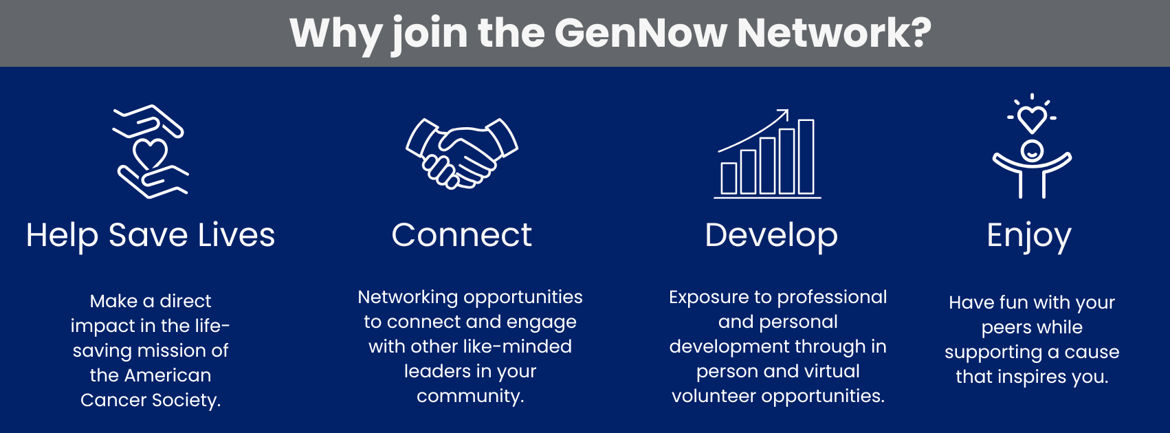 The American Cancer Society GenNow Network engages young professionals across the nation in the fight against cancer. These passionate individuals raise funds and awareness by leveraging their personal and professional networks, organizing mission – based activities, and fostering community partnerships. Members can make an impact through both in-person and virtual volunteering opportunities, while also benefiting from valuable networking and professional development opportunities.